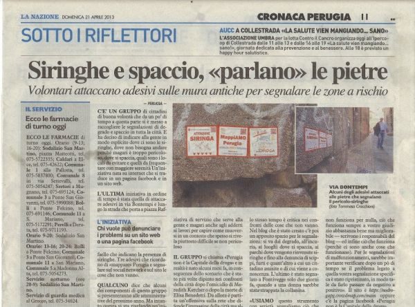 L’articolo racconta di una serie di adesivi attaccati sulle pietre dei muri antichi lungo alcune strade del centro di Perugia, a segnalare la presenza di siringhe o spaccio. Di qui il titolo con il riferimento alle pietre parlanti. Gli adesivi sono stati inventati e distribuiti da un gruppo di cittadini, che si riunisce virtualmente su facebook, nel gruppo “Perugia non è la capitale della droga” e si incontra anche “fisicamente” per portare a termine operazioni di riappropriazione del centro storico e di Perugia. Una iniziativa è stata, appunto, quella degli adesivi, ma l’ultima impresa del gruppo è stata quella di allestire, grazie alla donazione di un cittadino che è voluto rimanere anonimo, un’area giochi per bambini al parco della Cupa, prima noto, soprattutto, per essere luogo di consumo di droga. Più di un tossicodipendente è stato trovato morto per overdose sulle panchine di quell’area verde. Da un paio di settimane, invece, quel parco, grazie al presidio cittadino si sta rianimando.